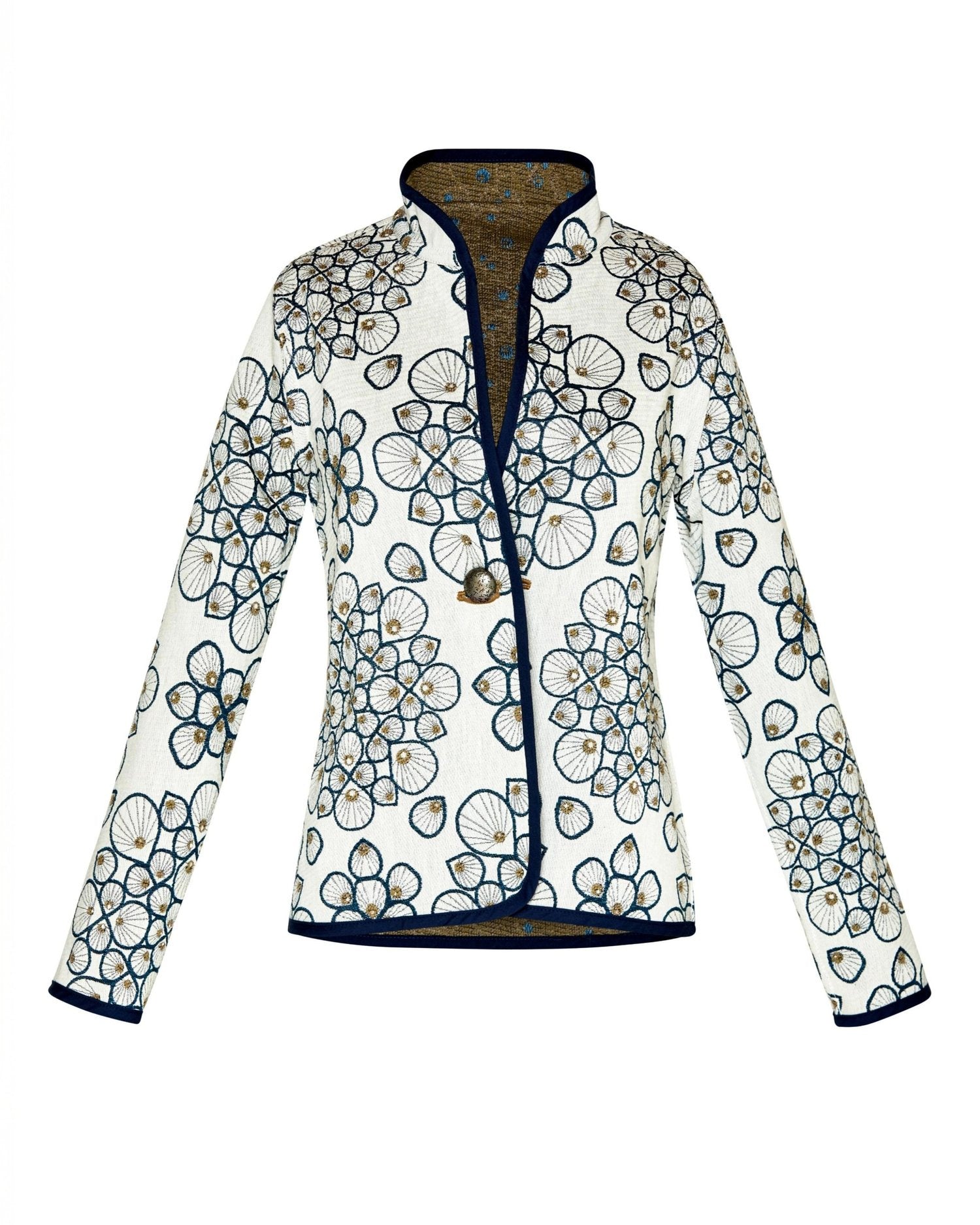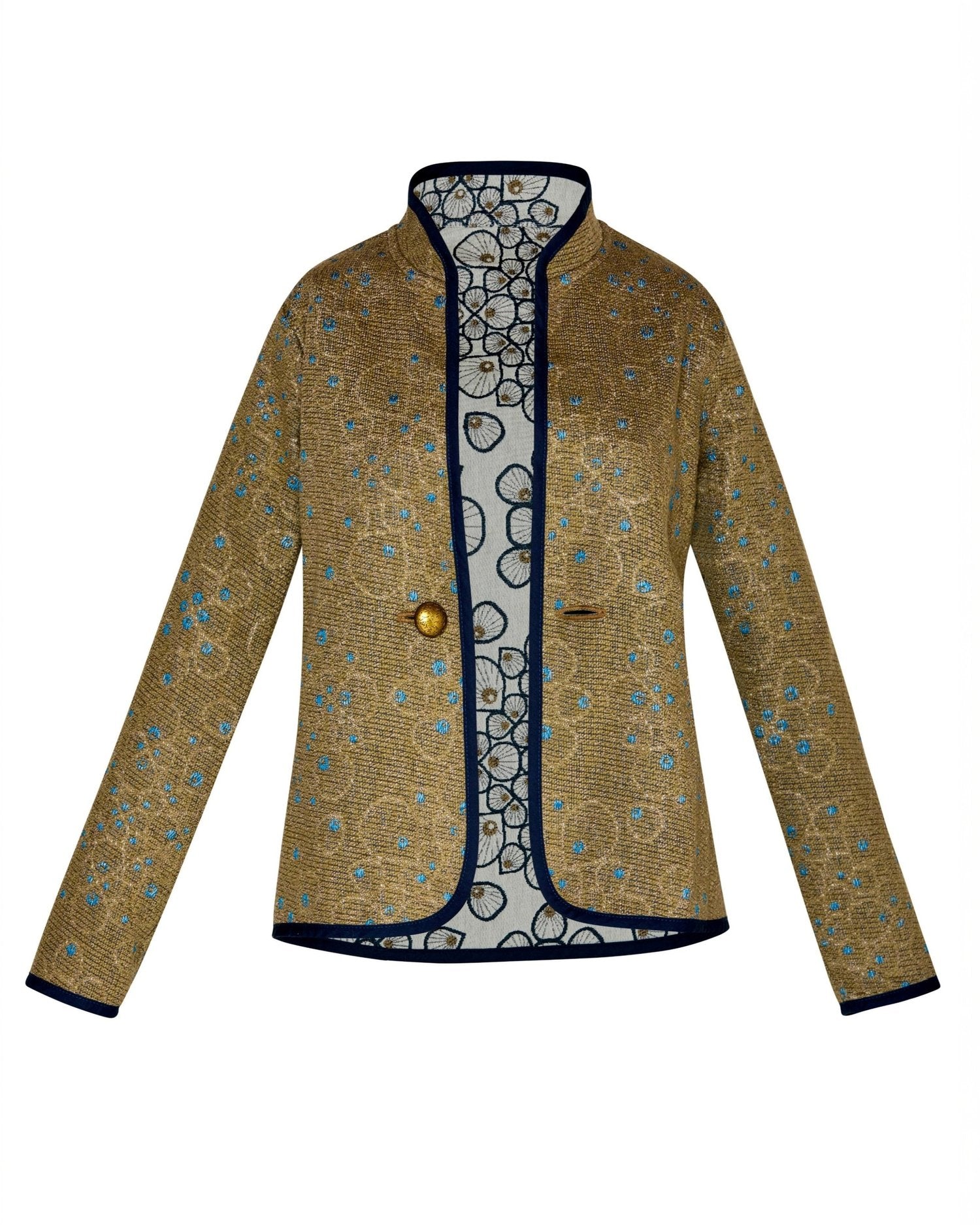 Warm, grounded, and effortlessly elegant. The Classic Café Nouveau Brown jacket features a rich blend of chocolate and caramel tones in an intricate jacquard pattern that nods to Art Nouveau design. Its structured silhouette and stand-up collar bring sophistication to everyday wear, while the reversible construction offers two distinct looks in one. Whether layered over denim or dressed up for an evening out, this jacket makes a statement without saying a word.